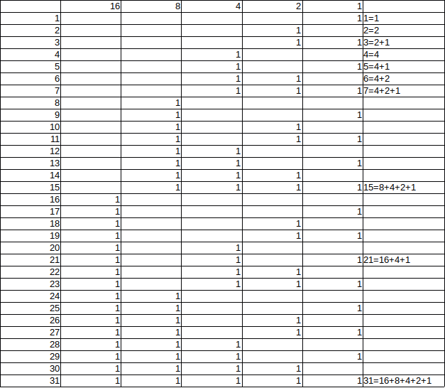 This is the binary number system, which is how computers store numbers. In computer memory each of the columns in the table would be 1 bit of memory. With 4 bits of memory the largest value you can store is 16+8+4+2+1=31. Many modern computers use 64 bit memory which can store values up to 18,446,744,073,709,551,615 (263+262+261+...+21).